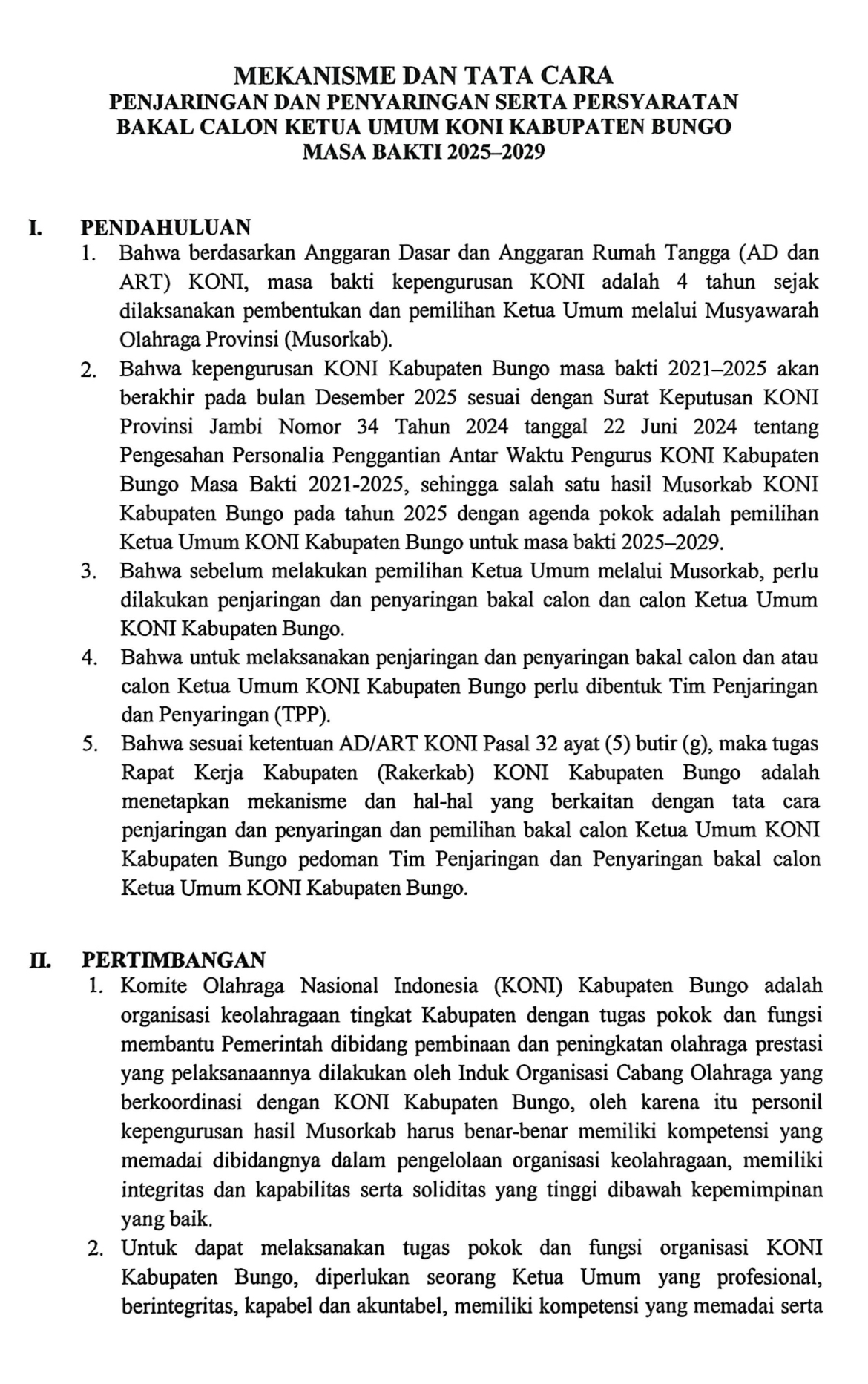 Budi menjelaskan, bahwa berdasarkan Keputusan Rapat Kerja Kabupaten (RAKERKAB) KONI Bungo Nomor : 04/RAKERKAB-KONI/XI/2025 pada Tanggal 8 November 2025, dan Surat Keputusan Ketua Umum KONI Kabupaten Bungo Nomor : 03 Tahun 2025 Tanggal 21 November 2025 tentang Penetapan Tim Penjaringan dan Penyaringan Bakal Calon Ketua Umum KONI Kabupaten Bungo Masa Bakti 2025-2029.