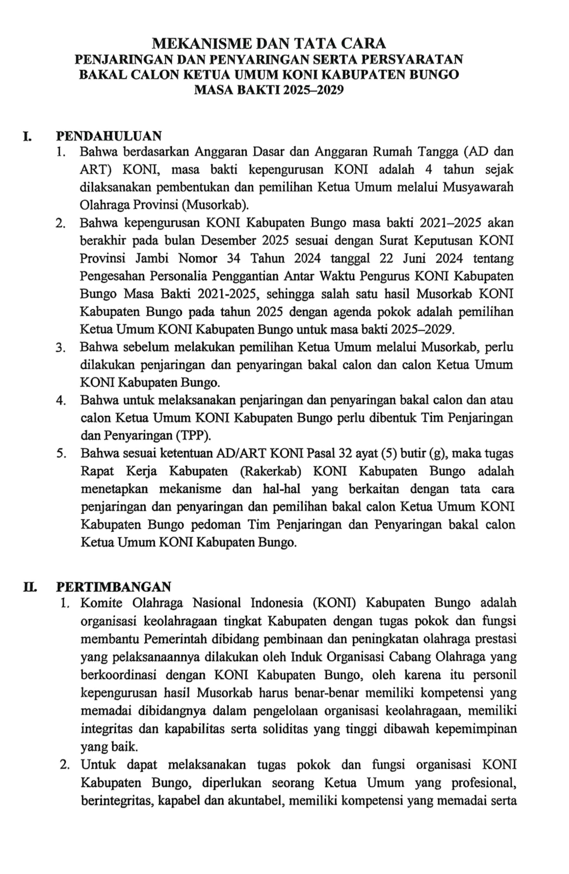 - Pertama, sosialisasi dan publikasi pembukaan pendaftaran bakal calon ketua umum KONI Bungo dilakukan pada 15-16 Desember 2025.