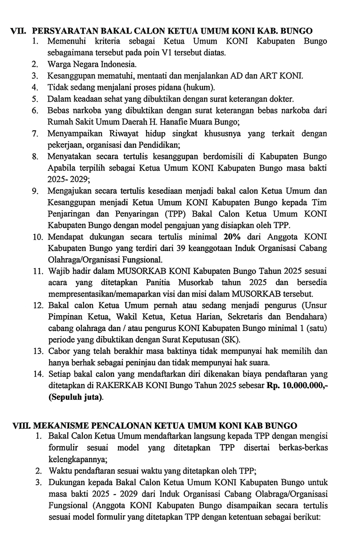 - Memperoleh dukungan tertulis, sebagai usulan Bakal Calon Ketum KONI Bungo masa Bakti 2025-2029 yang diusulkan minimal 20% atau 8 (delapan) Pengurus Kabupaten Cabang Olahraga anggota KONI Bungo, yang masih aktif masa kepengurusannya. Apabila pengurus Cabor memberikan dukungan lebih dari satu atau dukungan ganda kepada Balon Ketum KONI Bungo, maka dukungan tersebut tidak sah dan tidak mempunyai hak suara.
