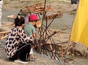 Sementara itu sebelumnya, ada seorang anak yang tengah serius memperhatikan proses kerja Kincir Sungai tersebut. ‘’Saya juga tidak tahu, dari tadi anak saya yang baru berumur enam tahun senang sekali melihat Kincir Sungai ini,’’ujar Supik ibu anak tersebut.